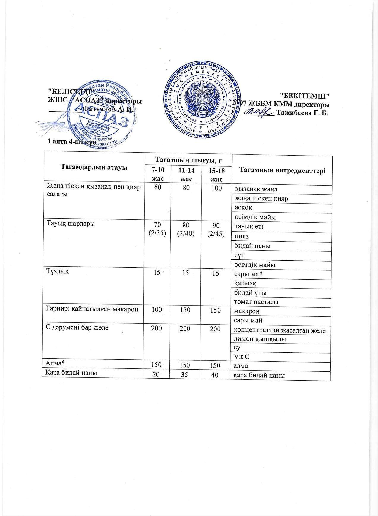 1 апта бейсенбі күнінің ас мәзірі