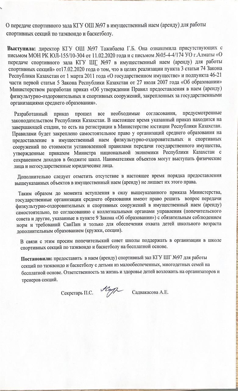 Протокол №1 заседания Попечительского совета КГУ ОШ №97