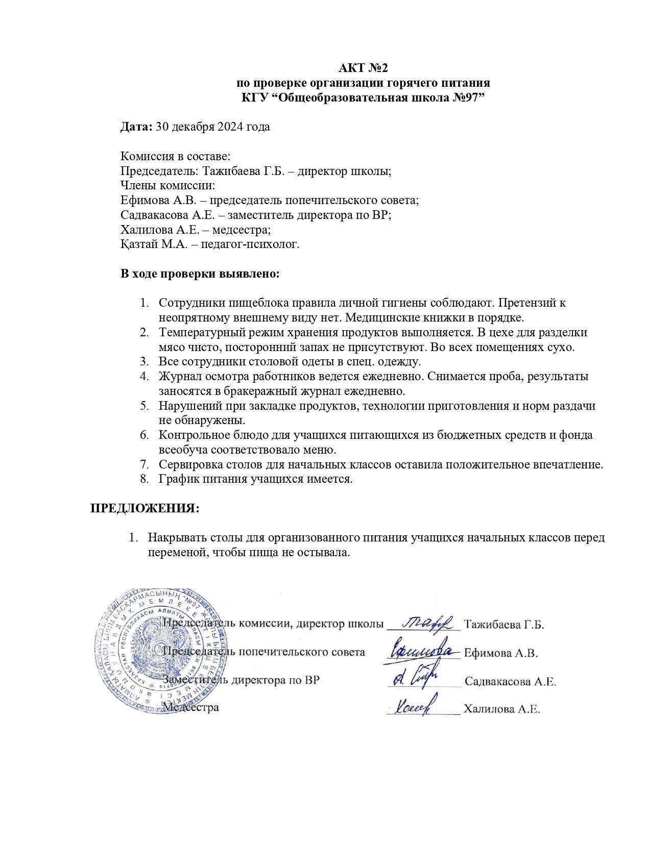 30 декабрь 2024 0 1 2 3 4 5 АКТ №2 по проверке организации горячего питания КГУ “Общеобразовательная школа №97”