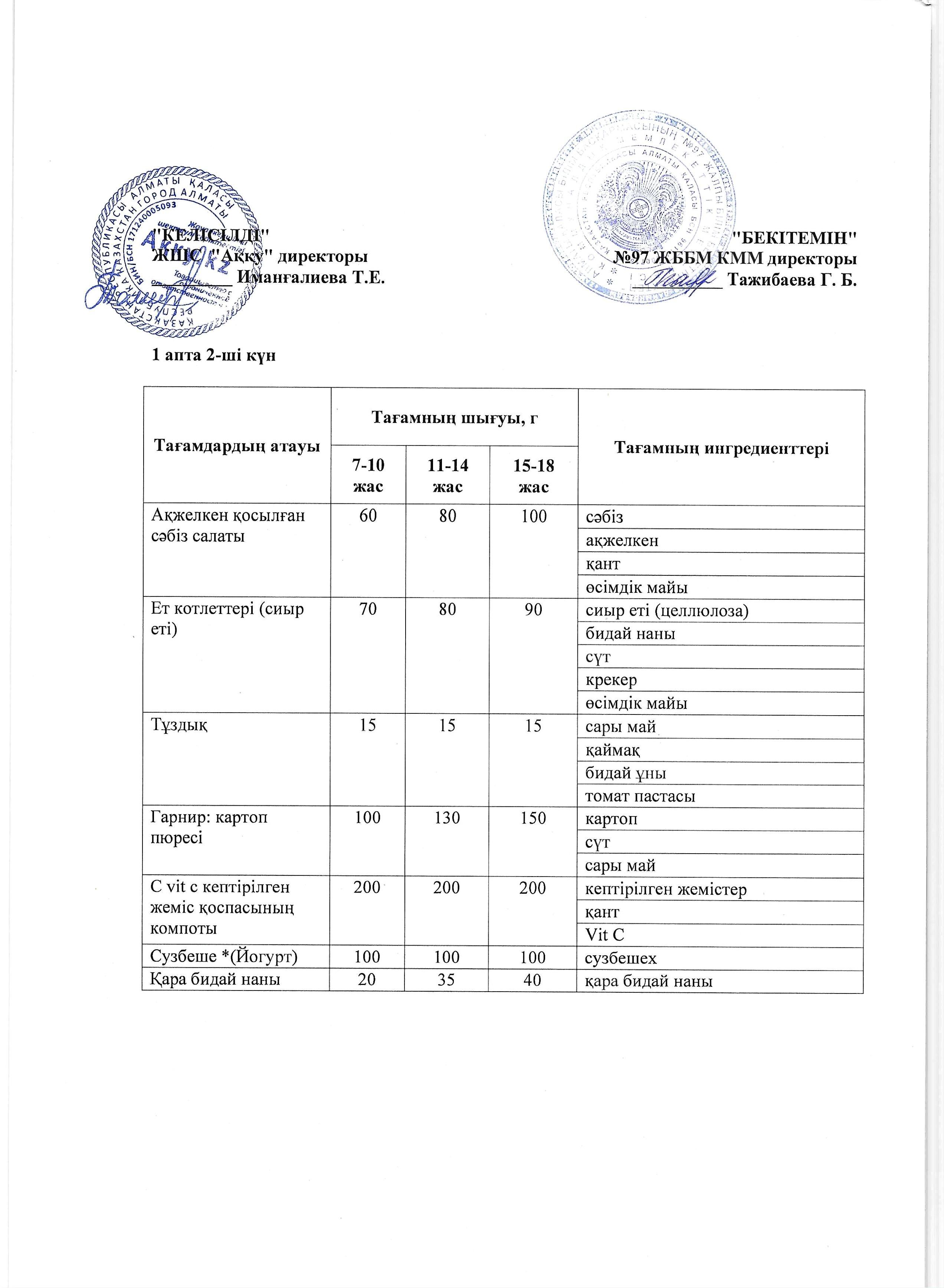 2 апта сейсенбі күнінің ас мәзірі