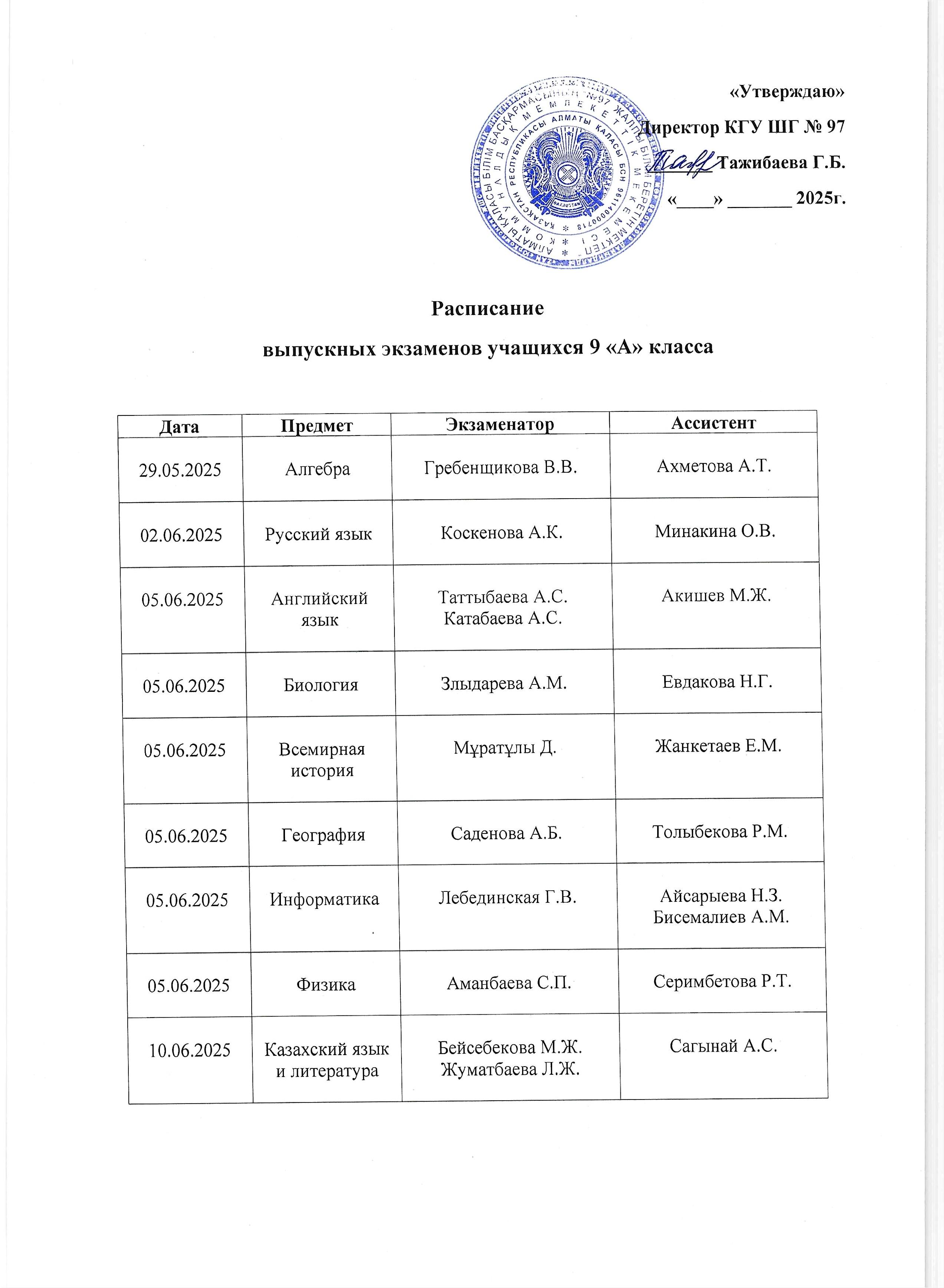 Расписание выпускных экзаменов учащихся 9 "А" класса