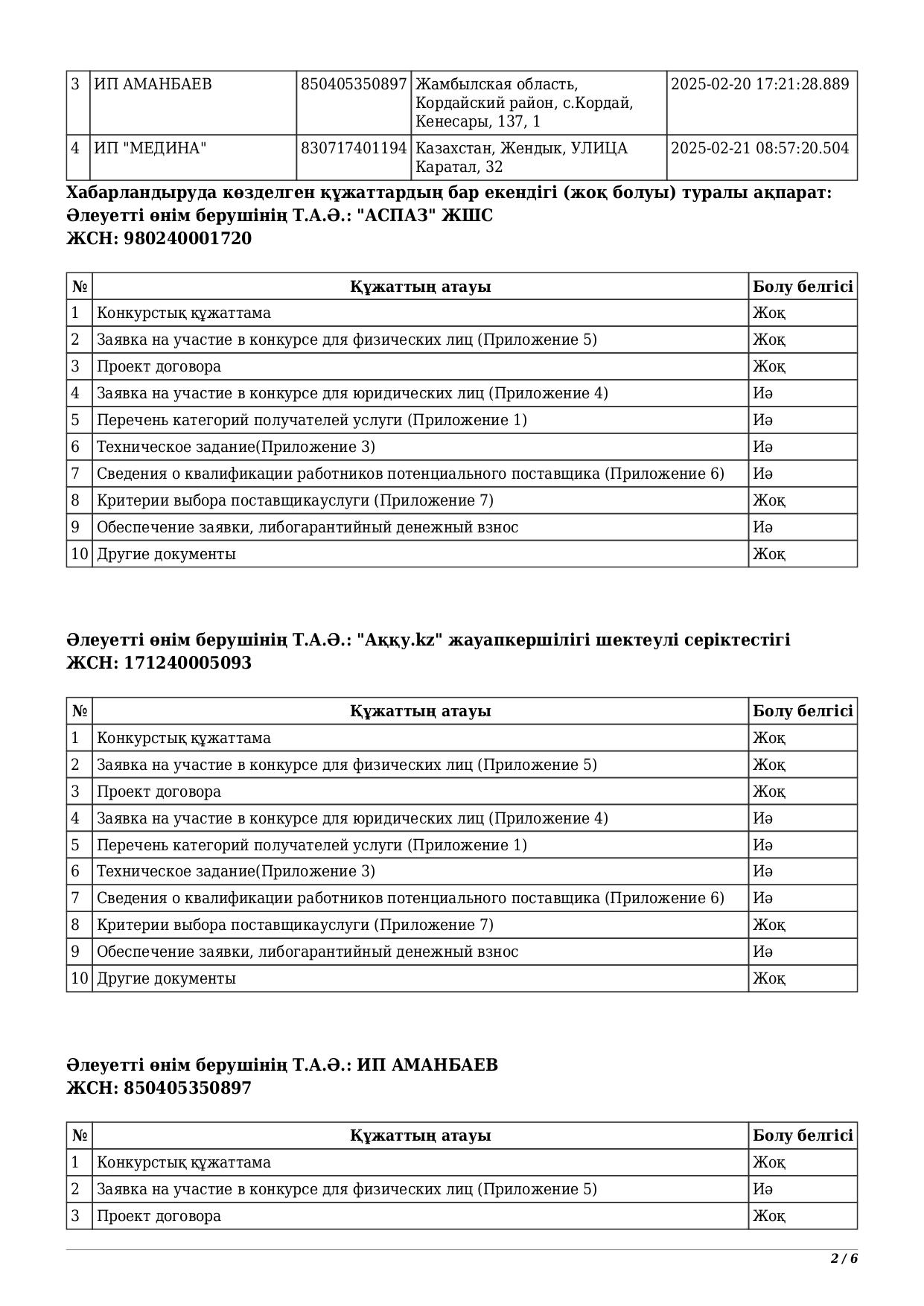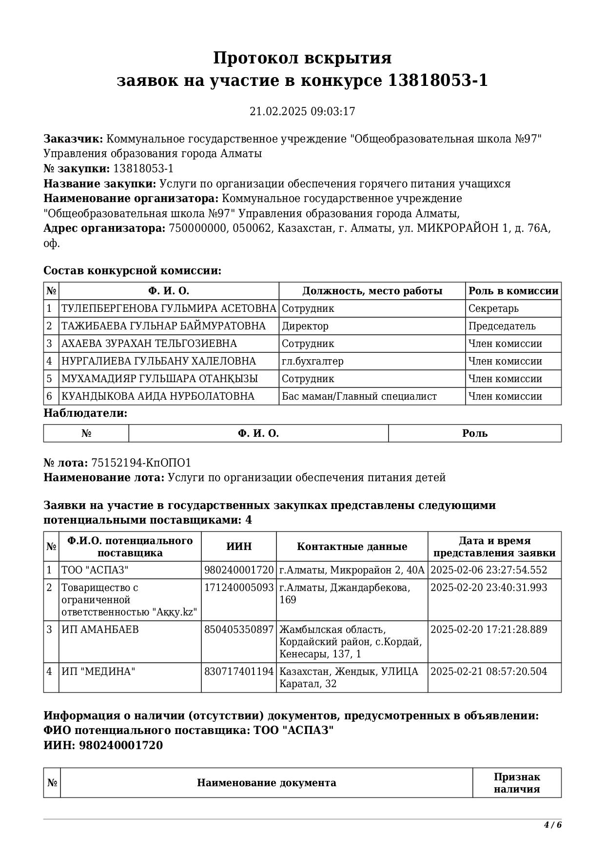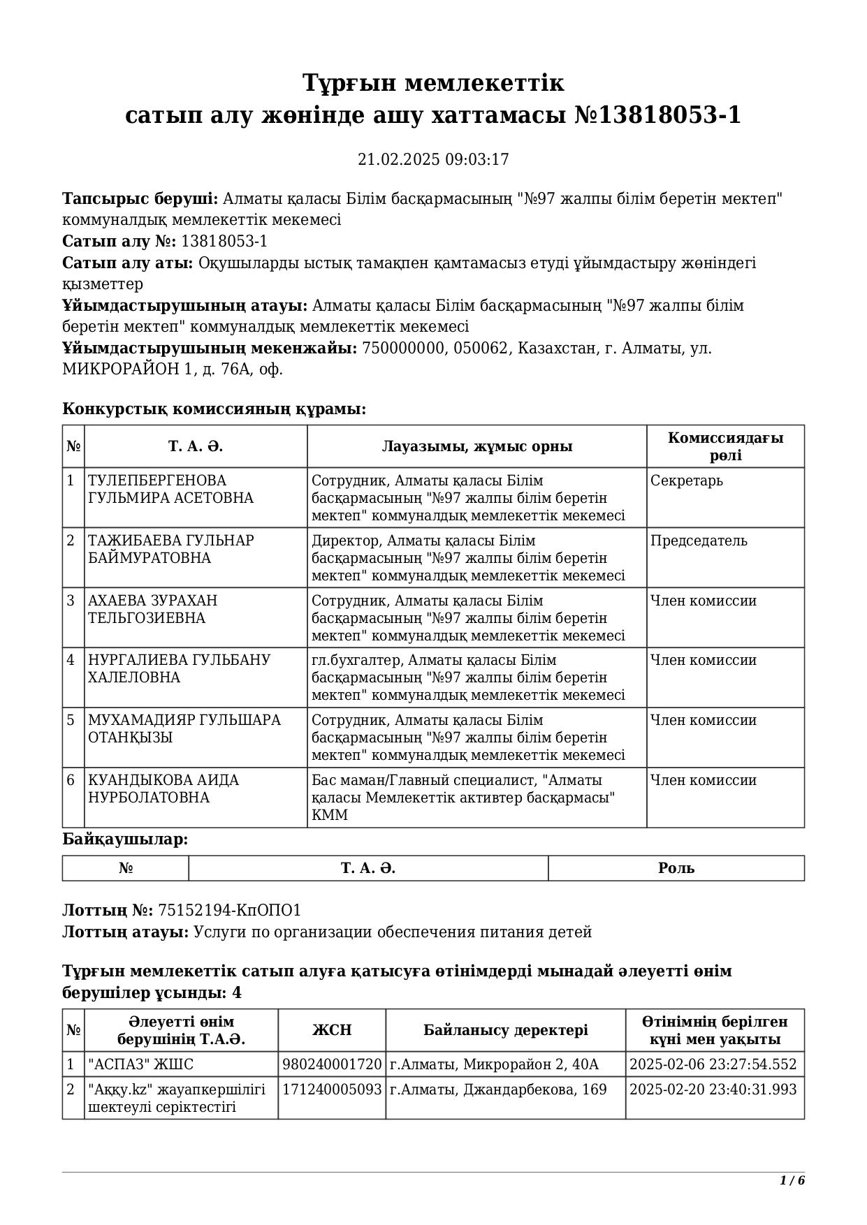 21 февраль 2025 0 1 2 3 4 5 Тұрғын мемлекеттік сатып алу жөнінде ашу хаттамасы №13818053-1/Протокол вскрытия заявок на участие в конкурсе 13818053-1