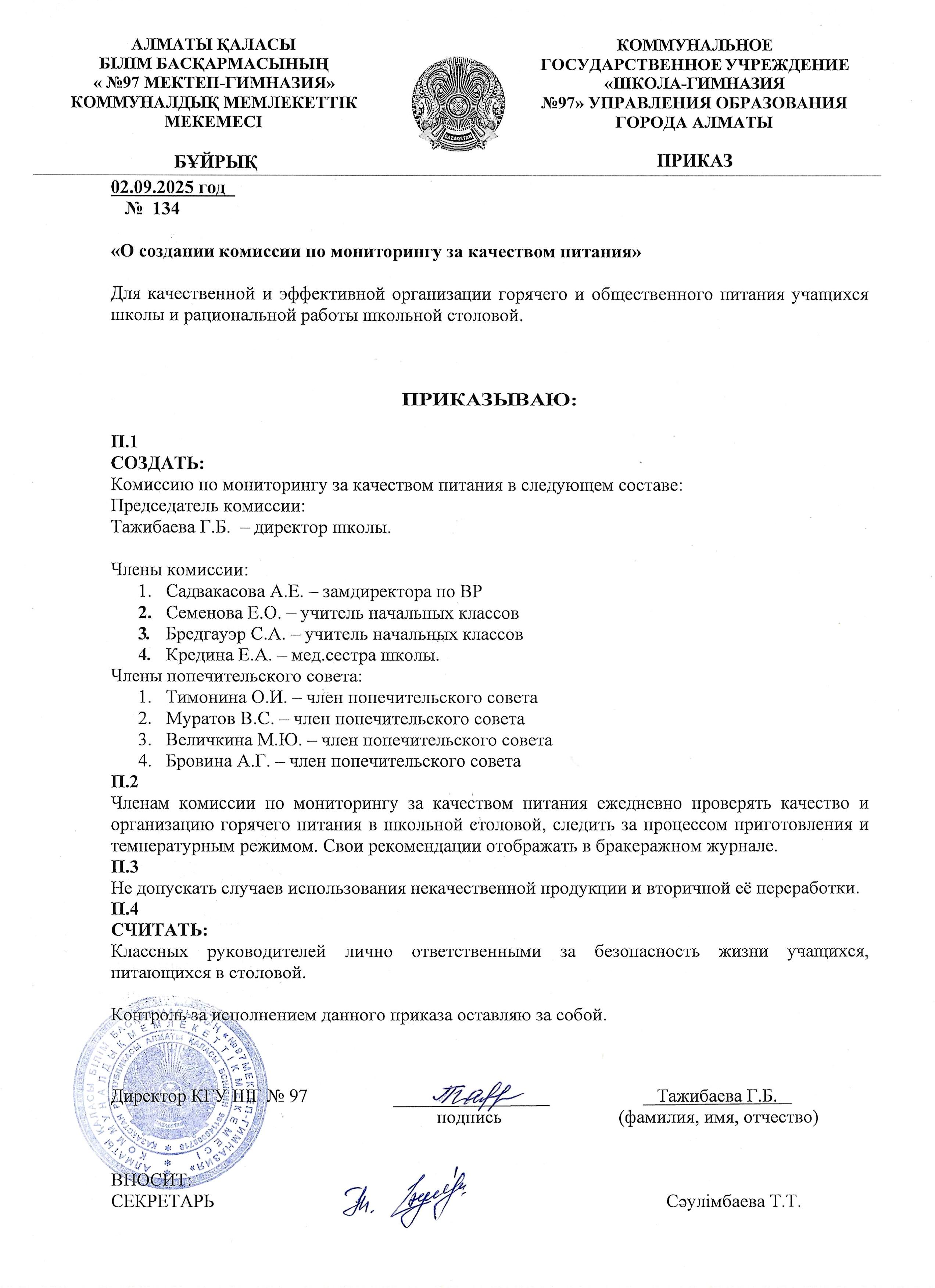 Приказ "О создании комиссии по мониторингу за качеством питания"