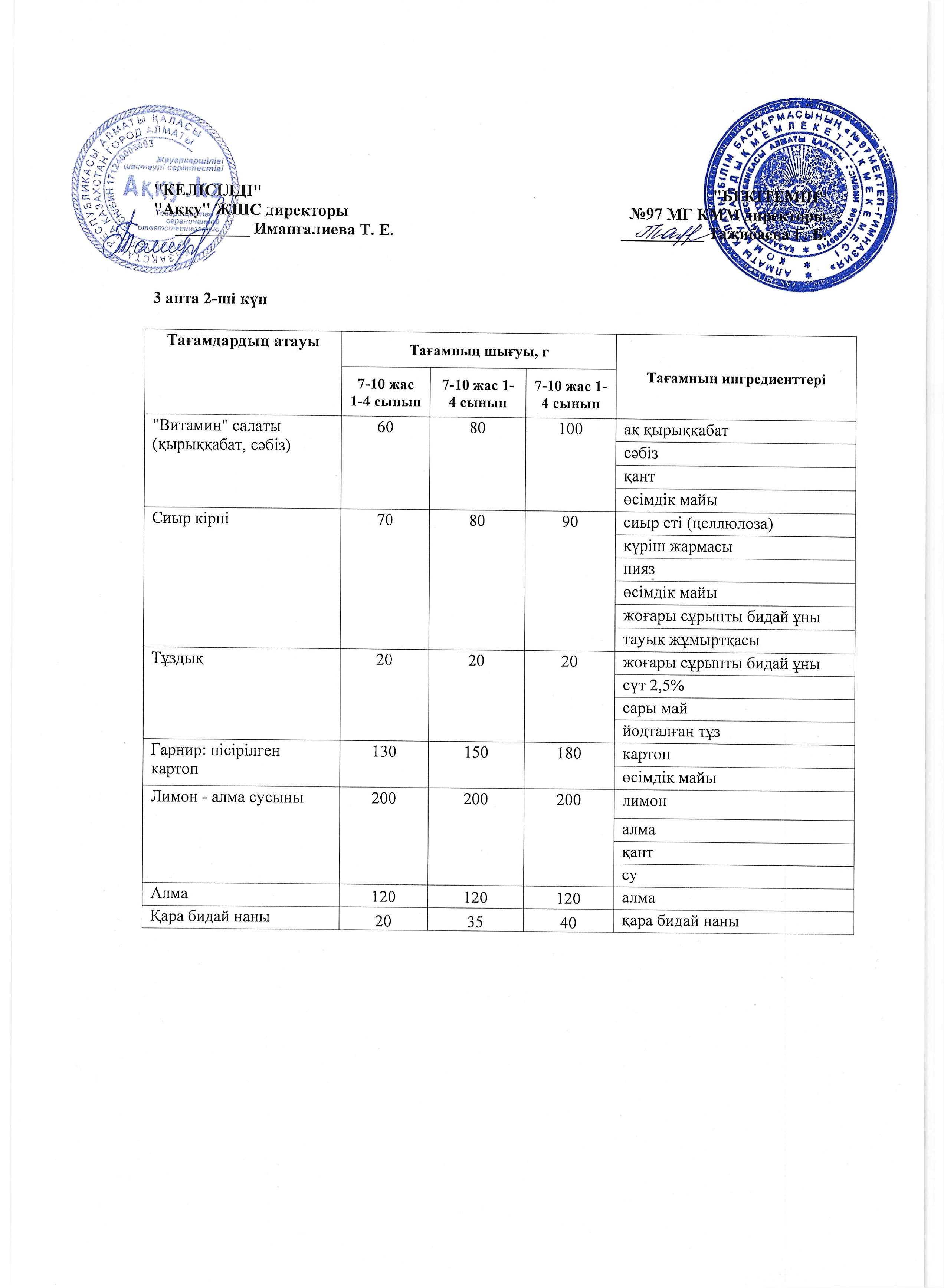 3 апта сәрсенбі күнінің ас мәзірі