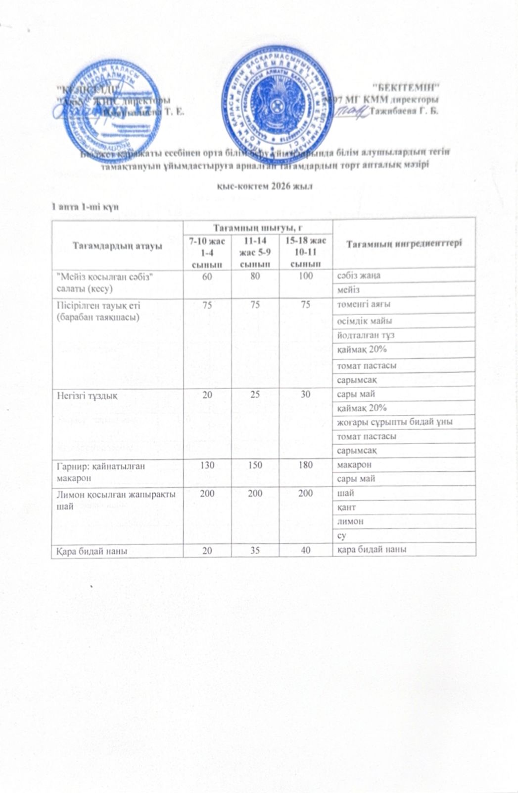 » 1 апта дүйсенбі күнінің ас мәзірі