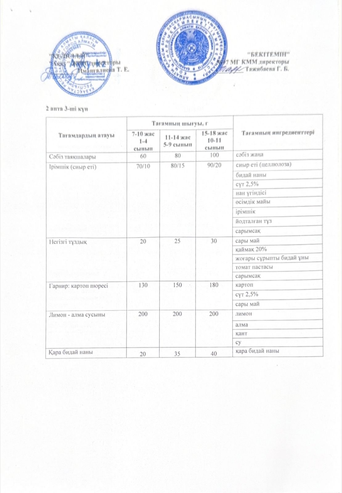 2 апта сәрсенбі күнінің ас мәзірі
