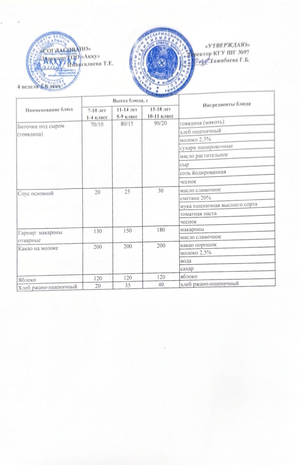 Меню 4 недели 1-й день