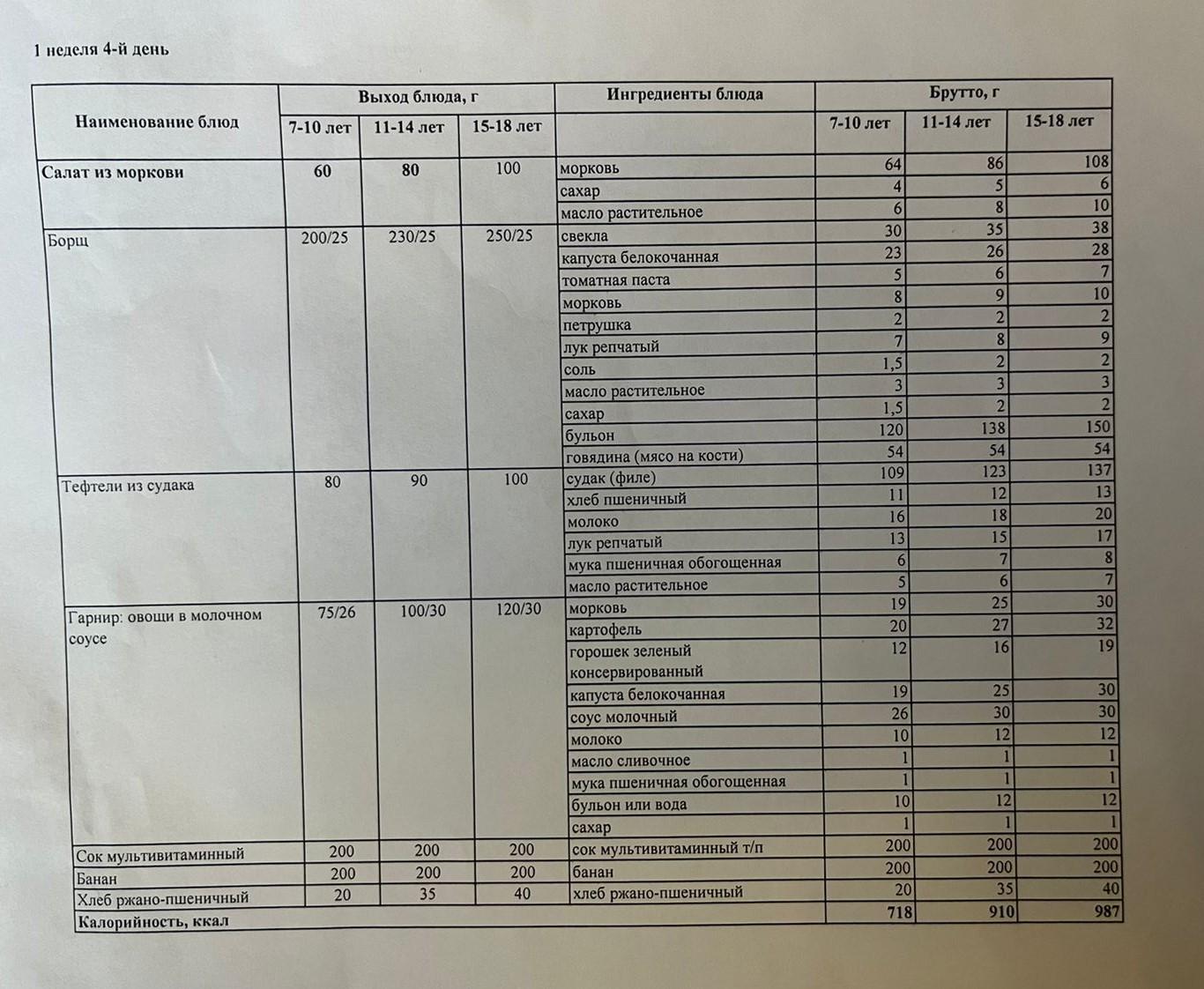 Меню 1- неделя, 4-ый день